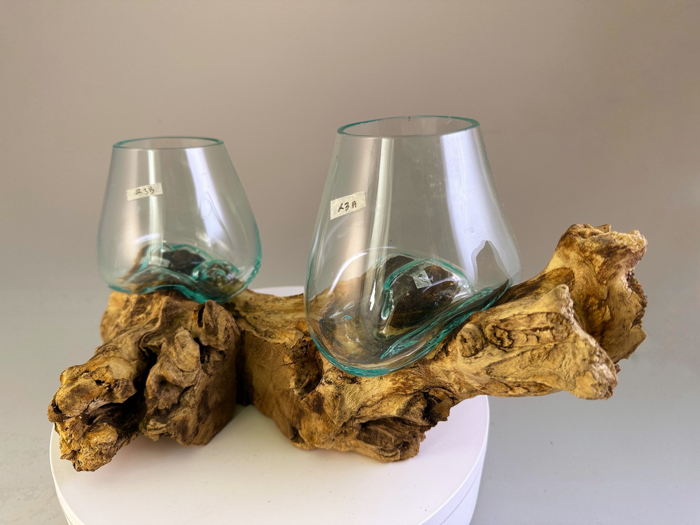 Svícny na čajové svíčky, které vznikají natavením žhavé skloviny na kořen teaku, jsou vkusnými díly umělecké řemeslné práce. Teakové kořeny mají nepravidelné tvary a každý kus je originální. Umělci pečlivě tvarují horkou sklovinu přičemž vytvářejí na povrchu kořene svícny pro jednu, dvě nebo tři čajové svíčky. Svícny mají jedinečný vzhled a zářivý barevný lesk, který přináší do prostoru eleganci a atmosféru.