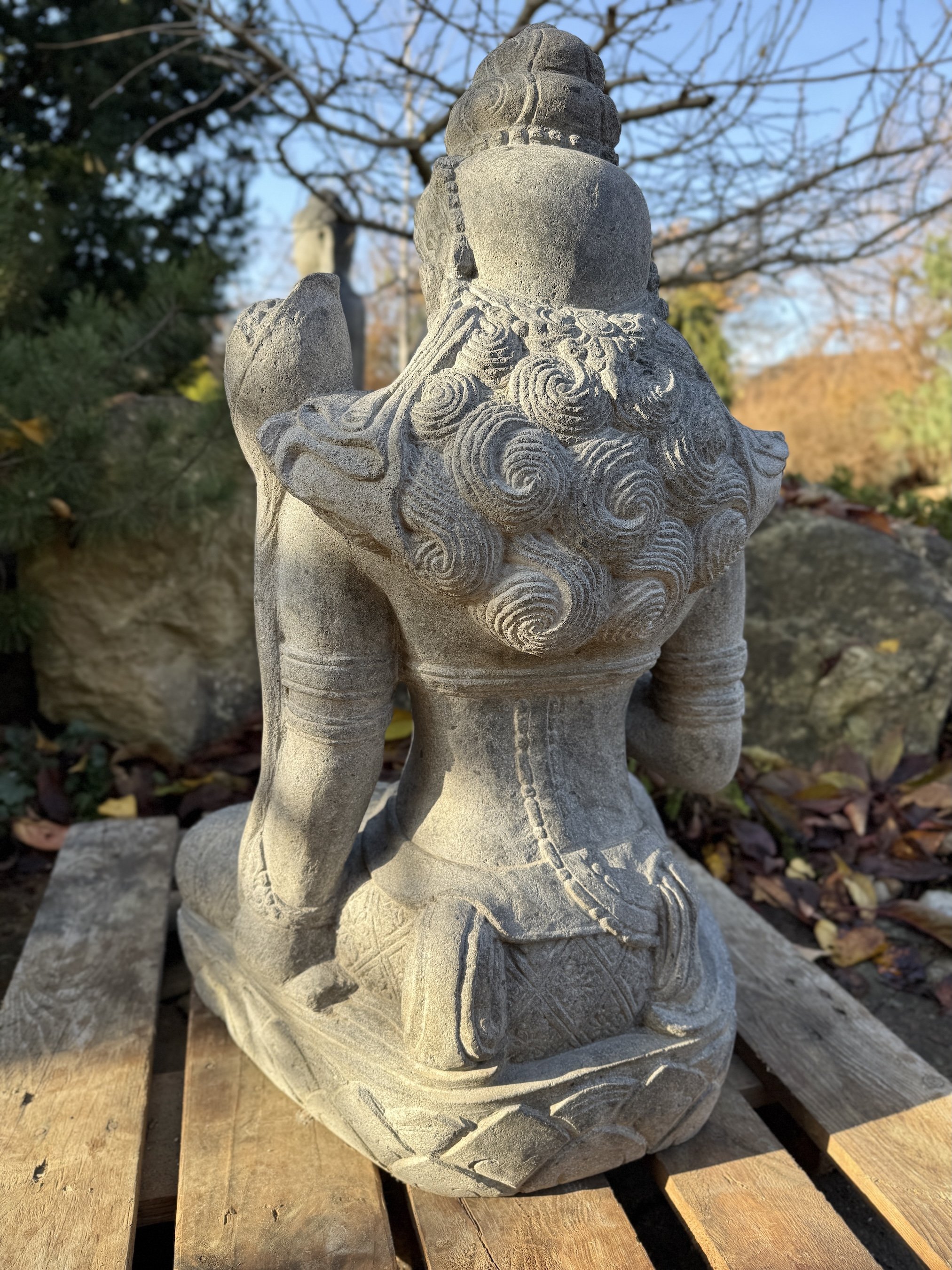 Detailně propracovaná sochyně Dewi z tvrdého říčního kamene, vyrobená na ostrově Bali. V hinduismu je Dewi (nebo Devi) pojem pro ženské božstvo, které představuje božskou sílu, ochranu a stvoření. Slovo "Devi" znamená "bohyně" a v hinduistické tradici označuje různé ženské božské aspekty, které mohou mít různé role, od ochrany po destrukci. Mezi známé formy Devi patří například Durga, bohyně síly, která ničí zlo, Lakšmí, bohyně hojnosti a prosperity, Sarasvatí, bohyně moudrosti a umění, nebo Parvatí, manželka boha Šivy, která symbolizuje lásku a rodinný život. Devi se objevuje v mnoha podobách, od jemných a pečujících (jako Lakšmí a Sarasvatí) až po drsné a silné formy (jako Durga a Kālī), které ničí zlo a obnovují rovnováhu. Uctívání Devi je běžné při svátcích jako Navaratri, kdy se oslavují její různé podoby a síly.