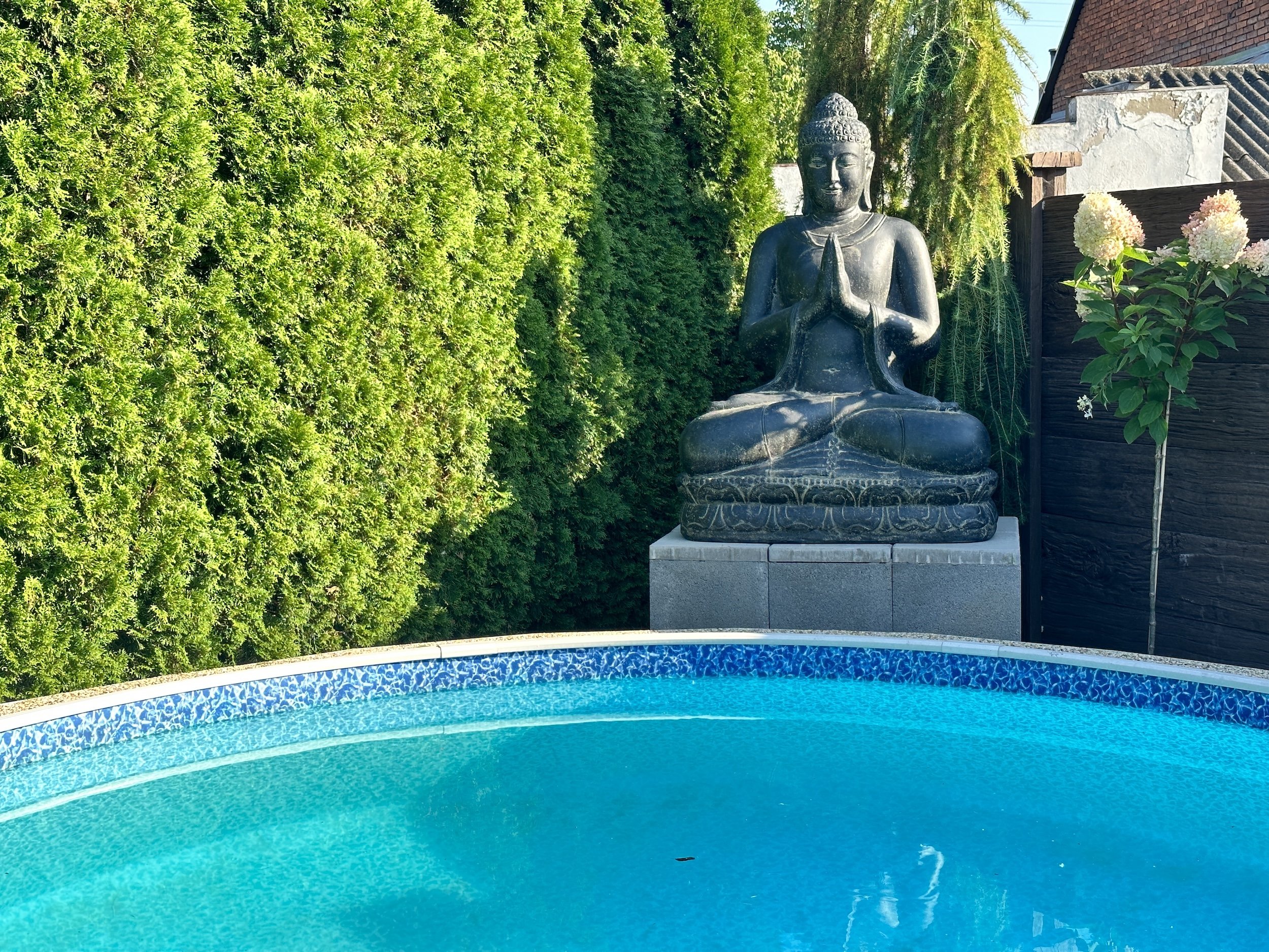Odlévaný Buddha z Bali strážící bazén ve středních Čechách...