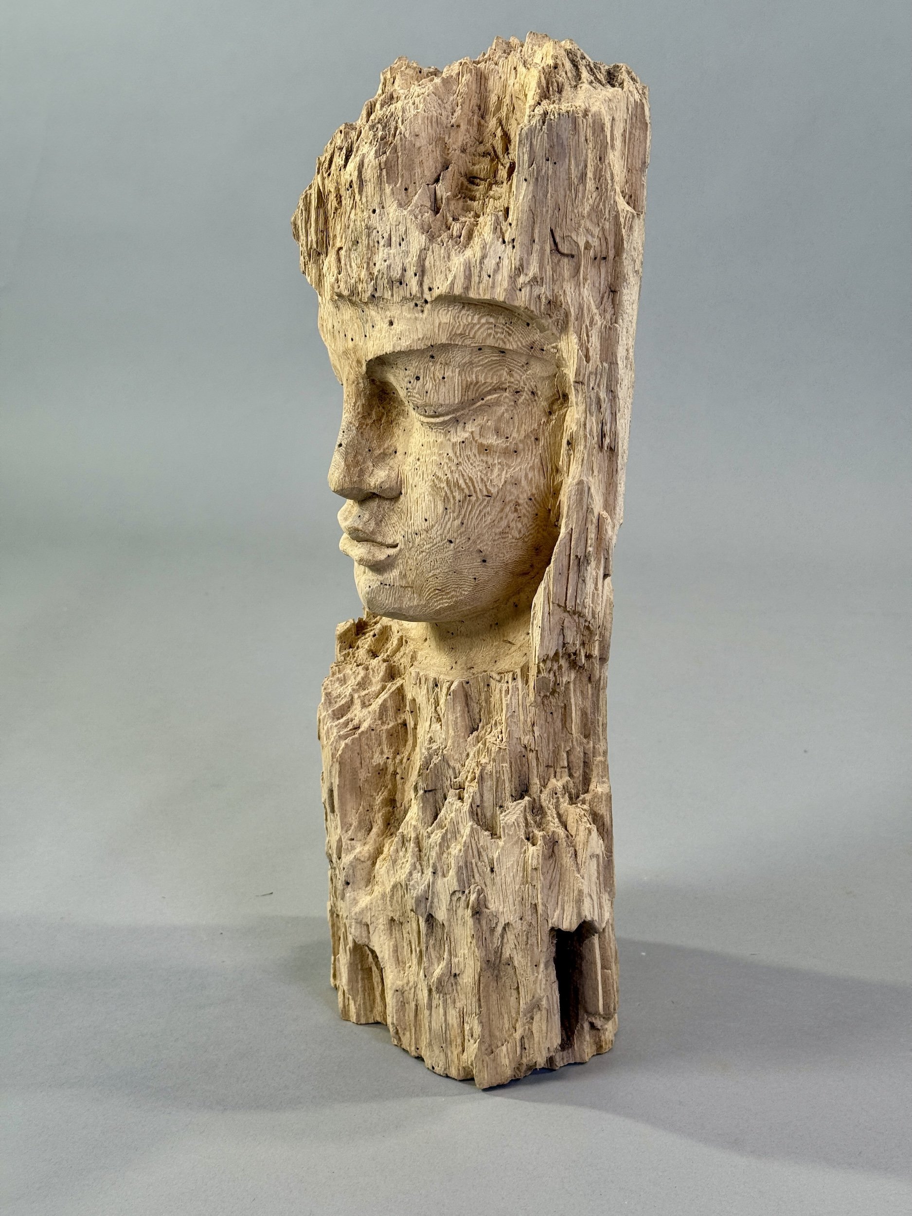 Horní a spodní část sochy byla ponechána v přirozeném, přírodním stavu, což zdůrazňuje organický původ materiálu a zároveň dodává objektu jedinečný charakter. Tento kontrast mezi dokonalostí tváře a surovostí dřeva vytváří silný vizuální i duchovní dojem. Lze vidět, vzhledem k tomu, že se jedná o naplavené dřevo, i stopy mo mořských živičiších...