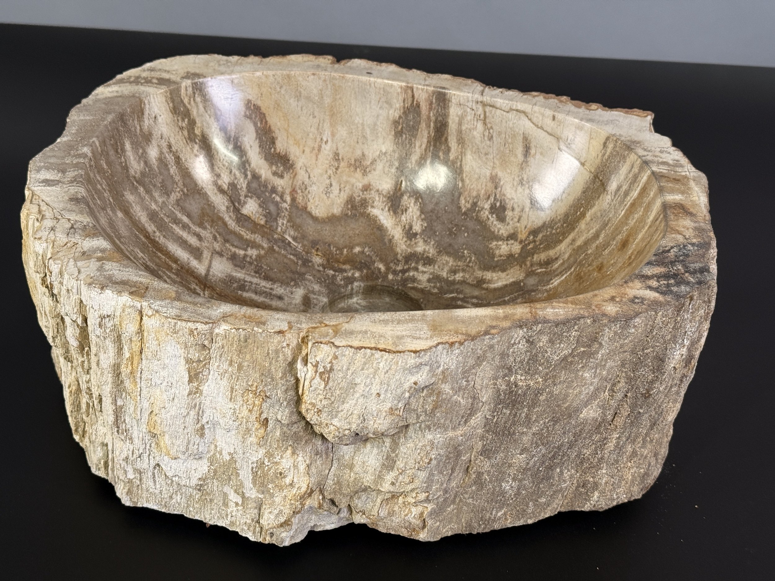 Každý kus je originál: vnější část si zachovává nepravidelný charakter původního kmene a „kůry“, zatímco vnitřek je vyhlazený do funkční mísy. U zkamenělého dřeva bývá vnitřní část velmi tvrdá, zatímco povrchové vrstvy v místech původní kůry mohou být měkčí a více strukturované – právě to vytváří krásný kontrast mezi surovostí a precizním opracováním.