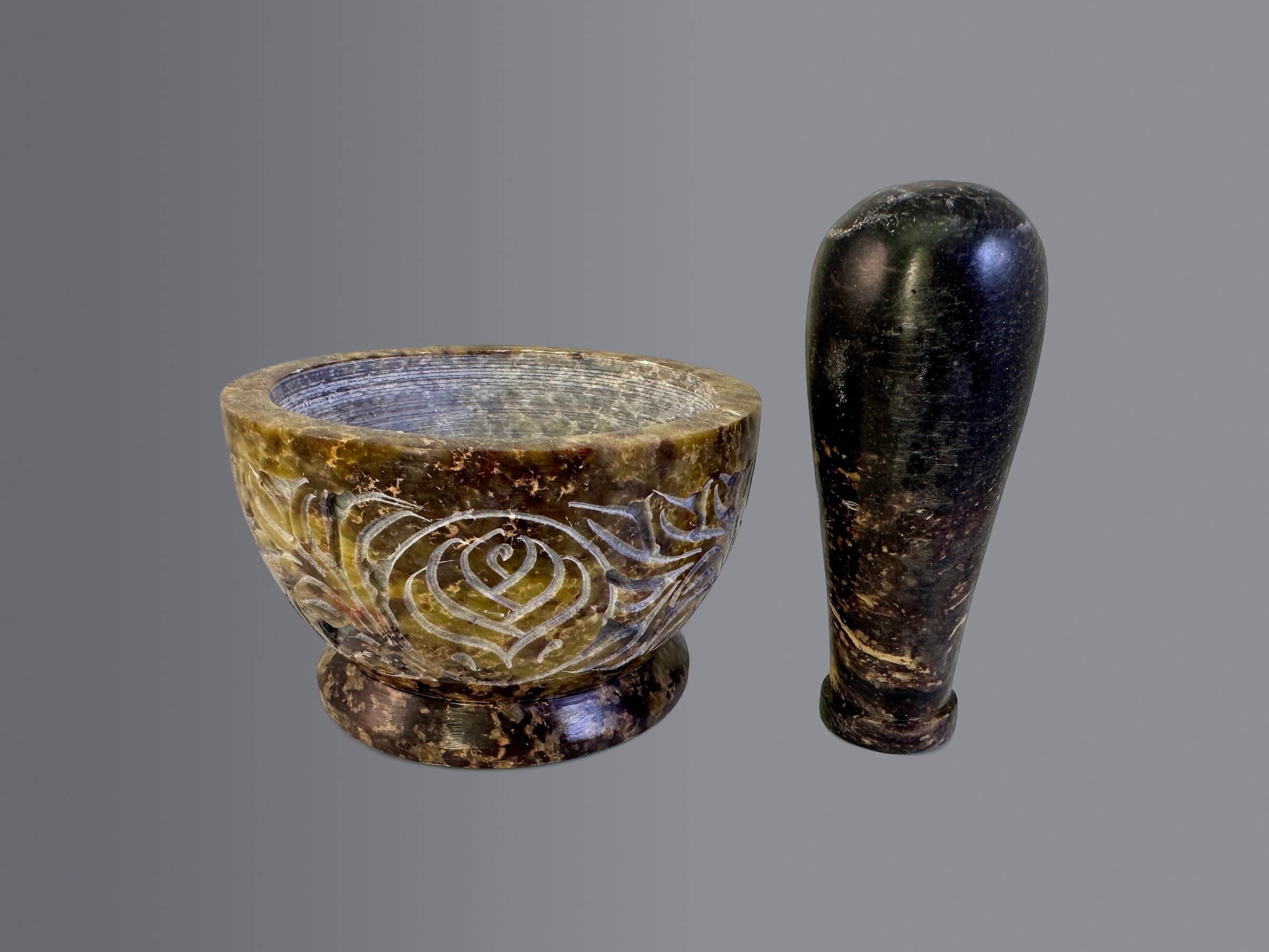 Nádherně zdobný, ornamentálně vyřezávaný kamenný (Steatit) hmoždířek s květinovými motivy. Jedná se o ruční práci s původem v Indii. Dekoratiní předmět, který však má i své užitné vlastnosti.