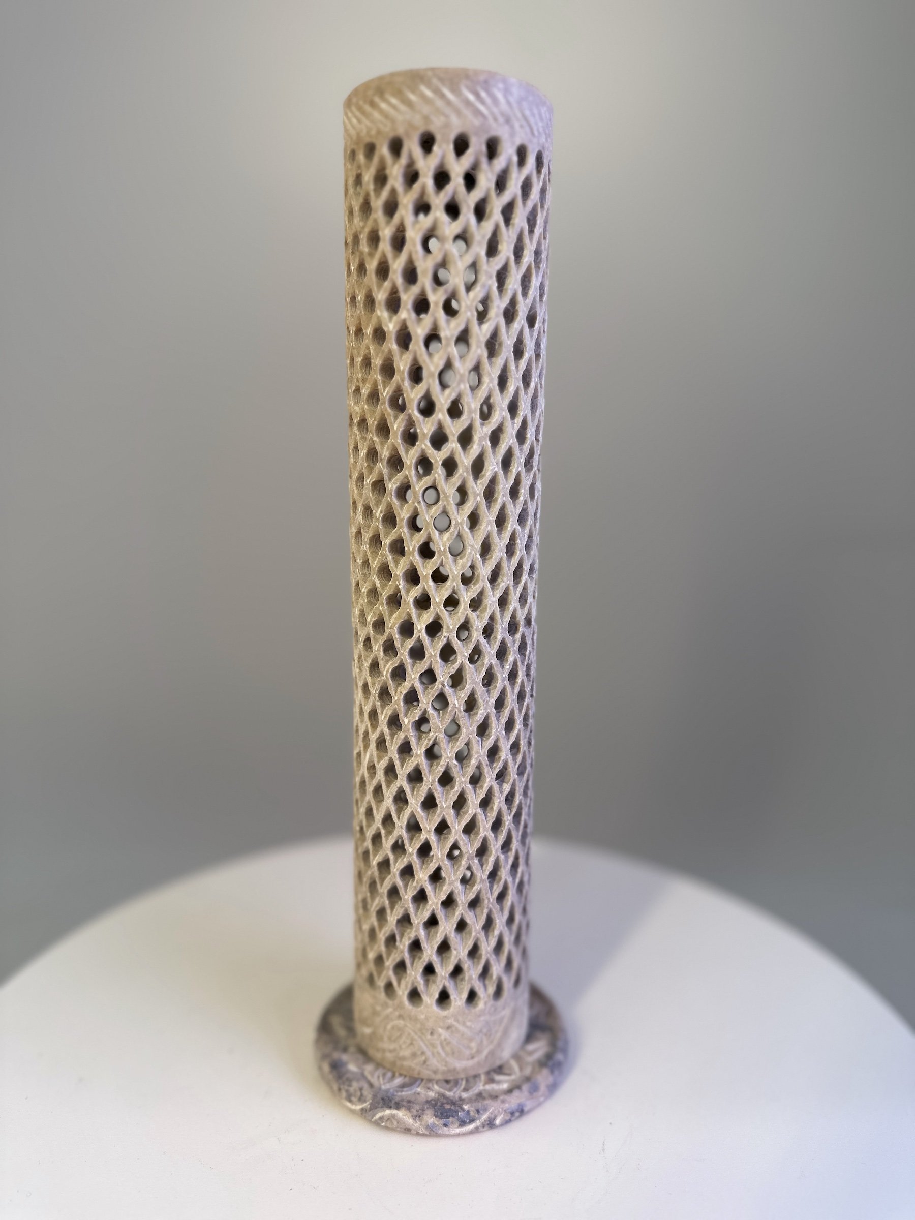 Prolamovaný, kamenný stojánek z vonného kamene mastku (ano, už samotný kámen příjemně voní) na indické vonné tyčinky v přirozené barvě s arabeskami. Husté prolamování umožňuje volné proudění vzduchu a zabezpečuje tak rovnoměrnější uvolňování vůní do místnosti. Stojánek je dvoudílný, ve spodní části jsou otvory pro zapíchnutí indických vonných tyčinek na bambusovém stonku.