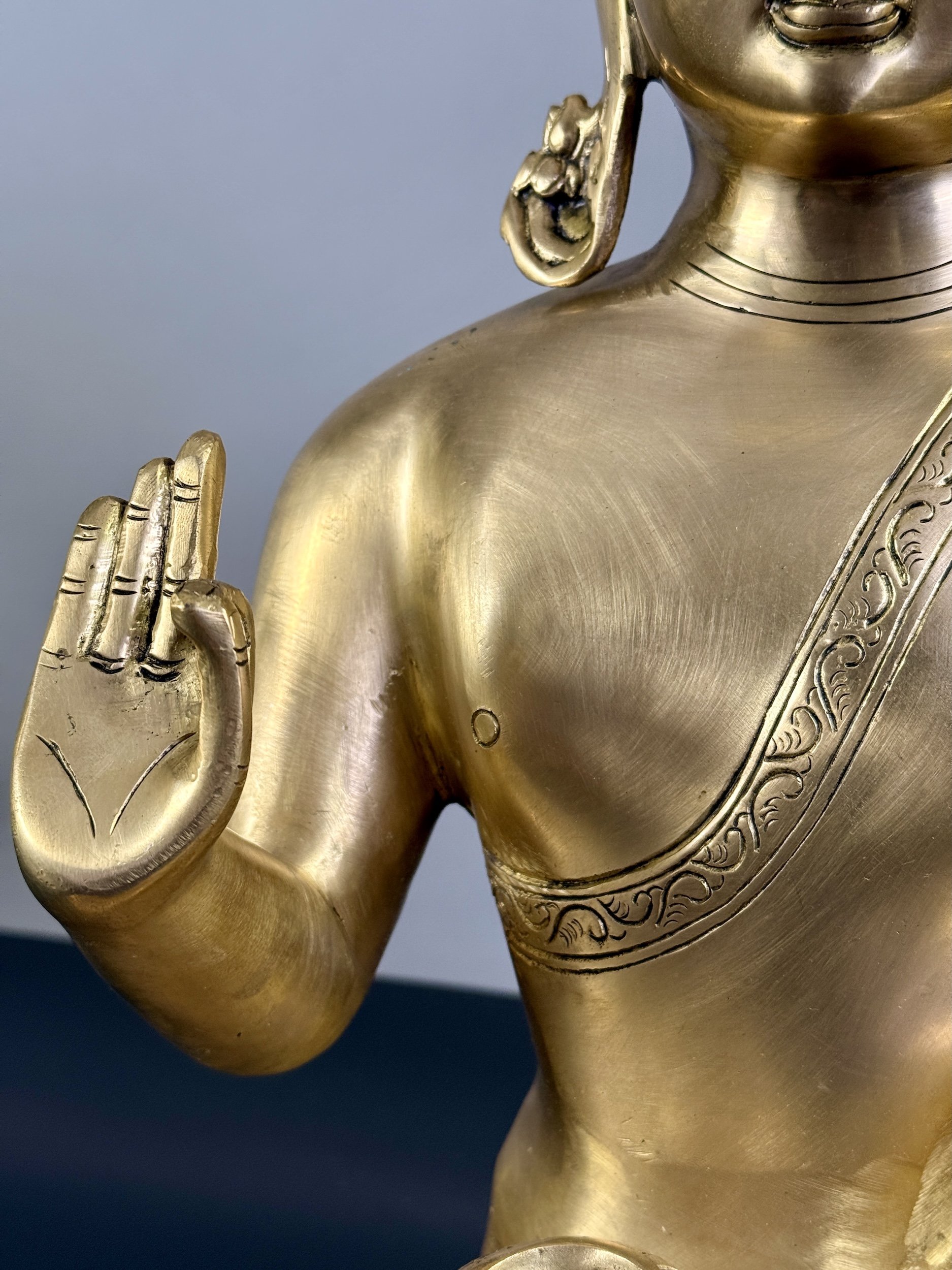 Motiv: sedící Buddha, gesto ochrany (zvednutá dlaň), miska v dlani