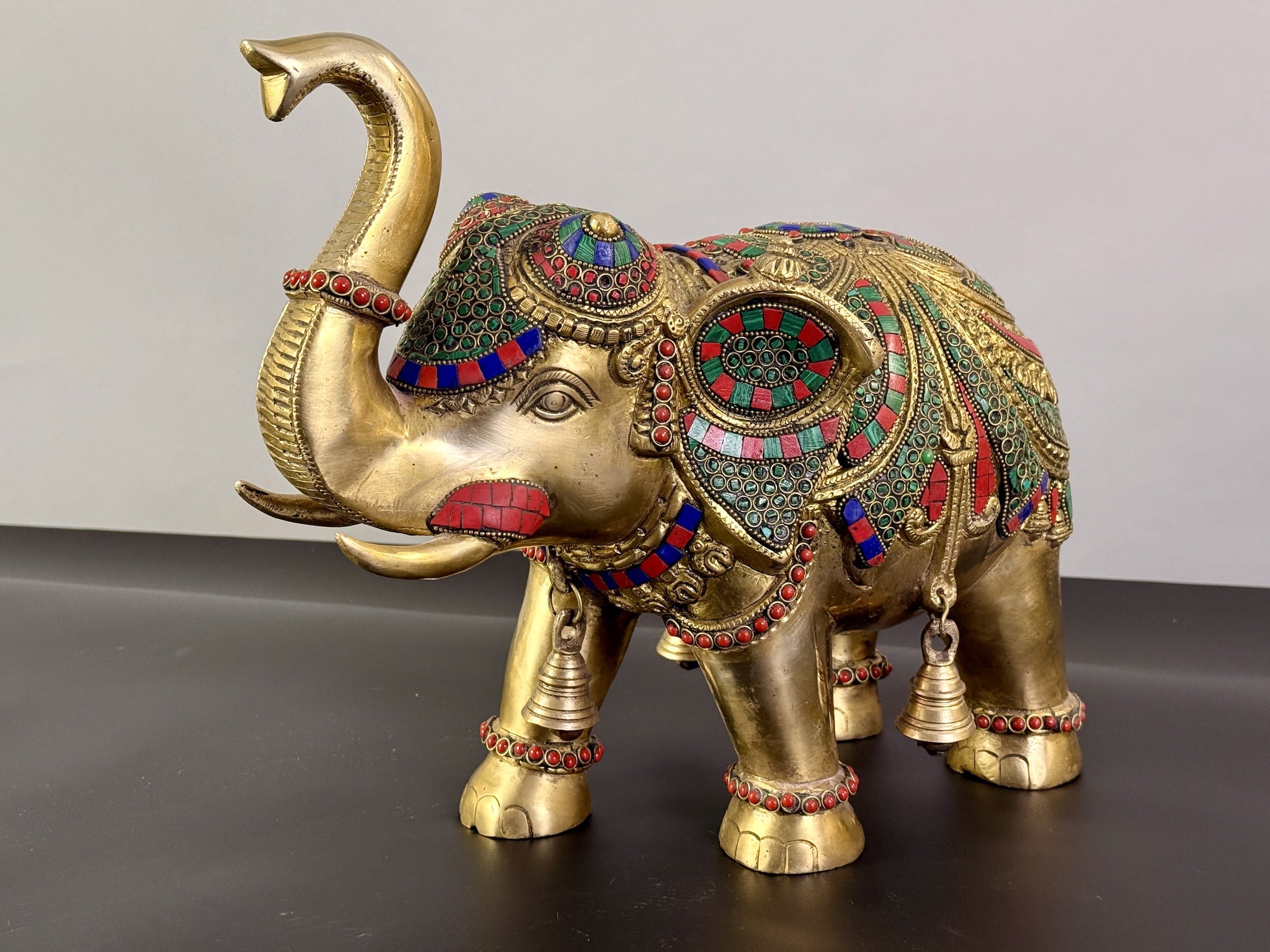 Tahle soška slona je přesně ten typ dekorace, který v prostoru okamžitě udělá dojem. Zlatavý kovový povrch doplňuje detailní zdobení připomínající mozaiku – kombinace červených, zelených, modrých a růžových tónů vytváří nádherný „šperkový“ efekt. Původ v Radžastánu (Indie) je na dekoru znát: bohaté ornamenty, barvy a šperkový styl jsou pro tamní řemeslné tradice typické. Zvednutý chobot dodává celé figurce dynamiku a v mnoha tradicích se pojí se symbolem štěstí, síly a ochrany domova.