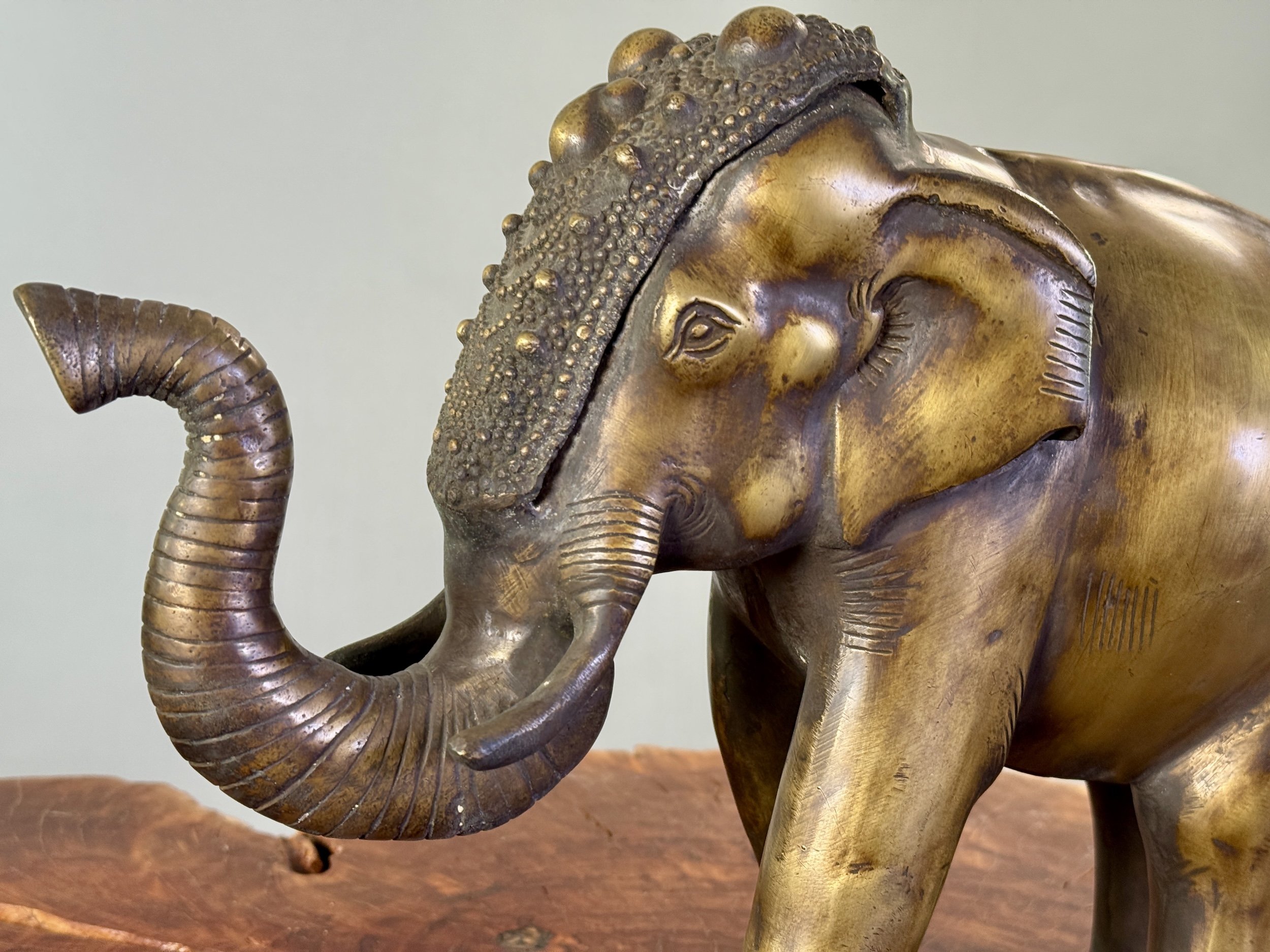 Povrch slona je jemně patinovaný a zdobený plastickými ornamenty na čele, které připomínají slavnostní ozdoby indických chrámových slonů. Robustní provedení slona a elegantní křivky z něj dělají ideální doplněk do reprezentačních prostor, stylových interiérů i jako součást sbírky milovníka orientálního umění.