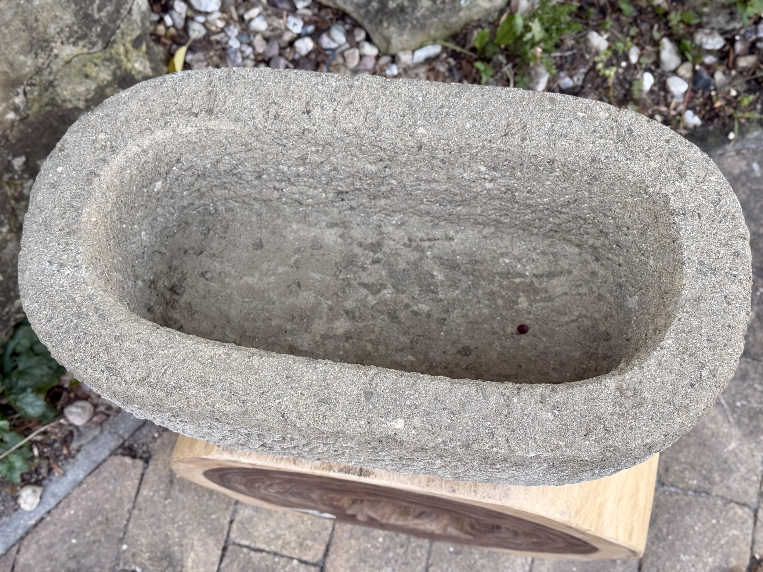 Tento oválný květináč je vyroben ručním tesáním z lávového kamene Bazanit, jenž je typický pro Bali. Povrch nese stopy tradičního opracování, které mu dodává autentický charakter a zdůrazňuje přírodní strukturu kamene.