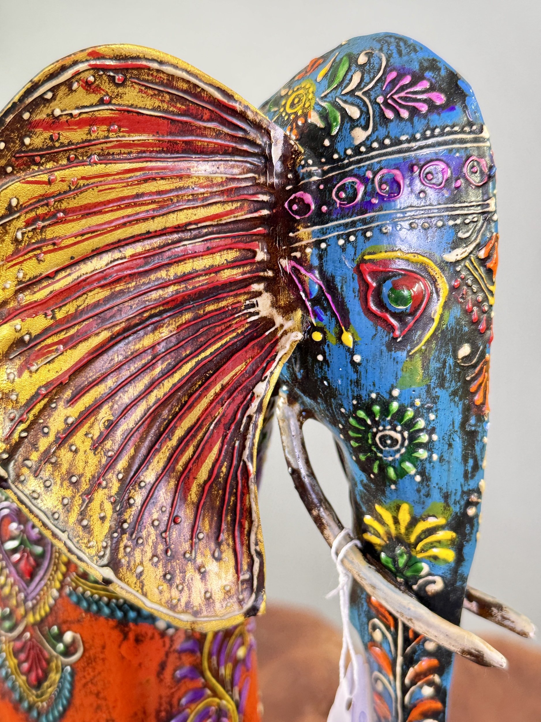 Tento menší, ale stejně působivý ručně malovaný slon z Indie v sobě spojuje tradiční řemeslné zpracování a výrazný estetický styl. Je vysoký 42 cm a je dostupný ve dvou barevných provedeních – se základní barvou červenou nebo oranžovou. Obě varianty jsou ručně dekorovány jemnými indickými ornamenty, které vytvářejí bohatý a pestrý dojem.