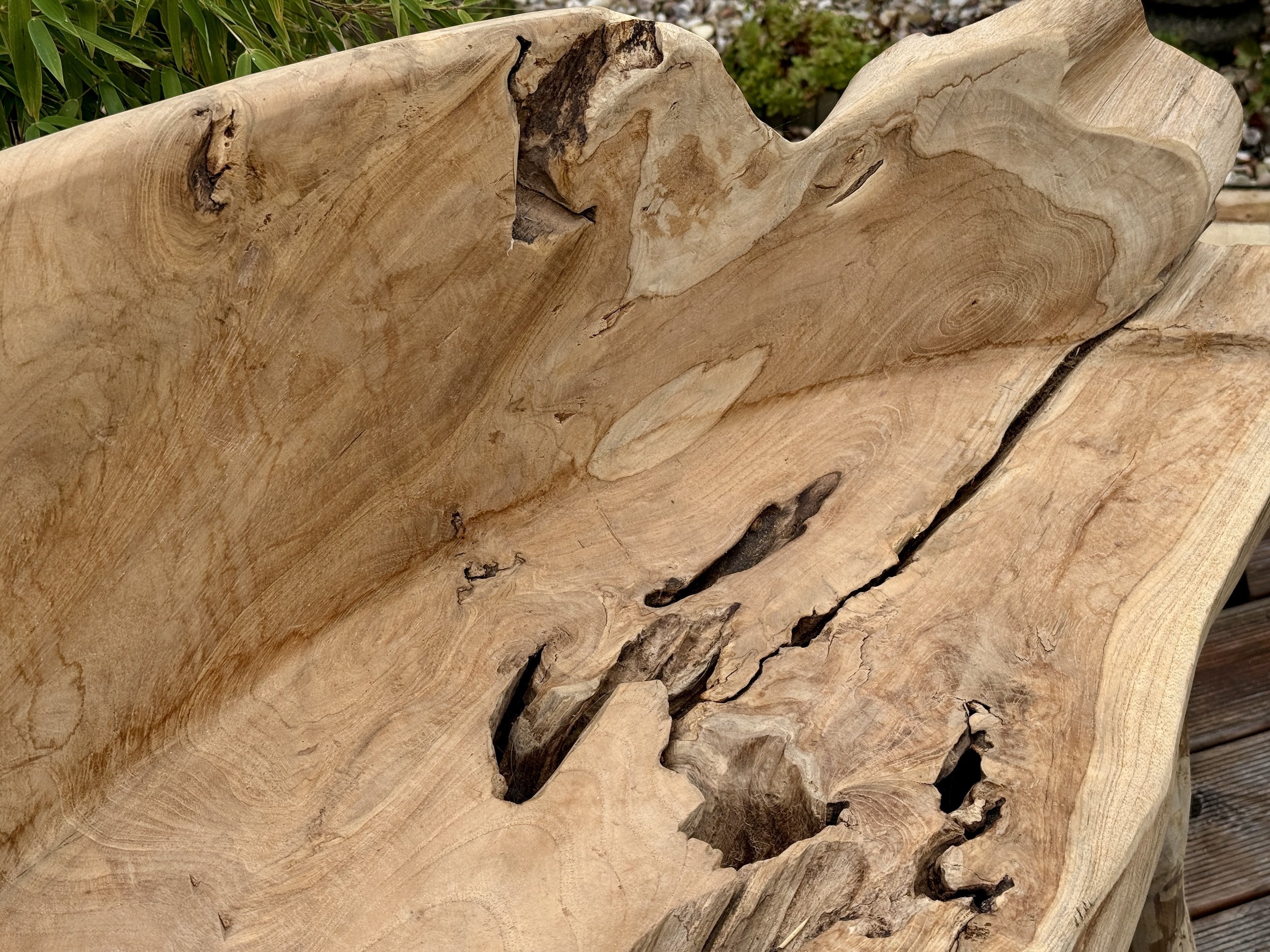 Ručně vyrobená lavička z kořenového teakového dřeva – přírodní originalita z Jávy