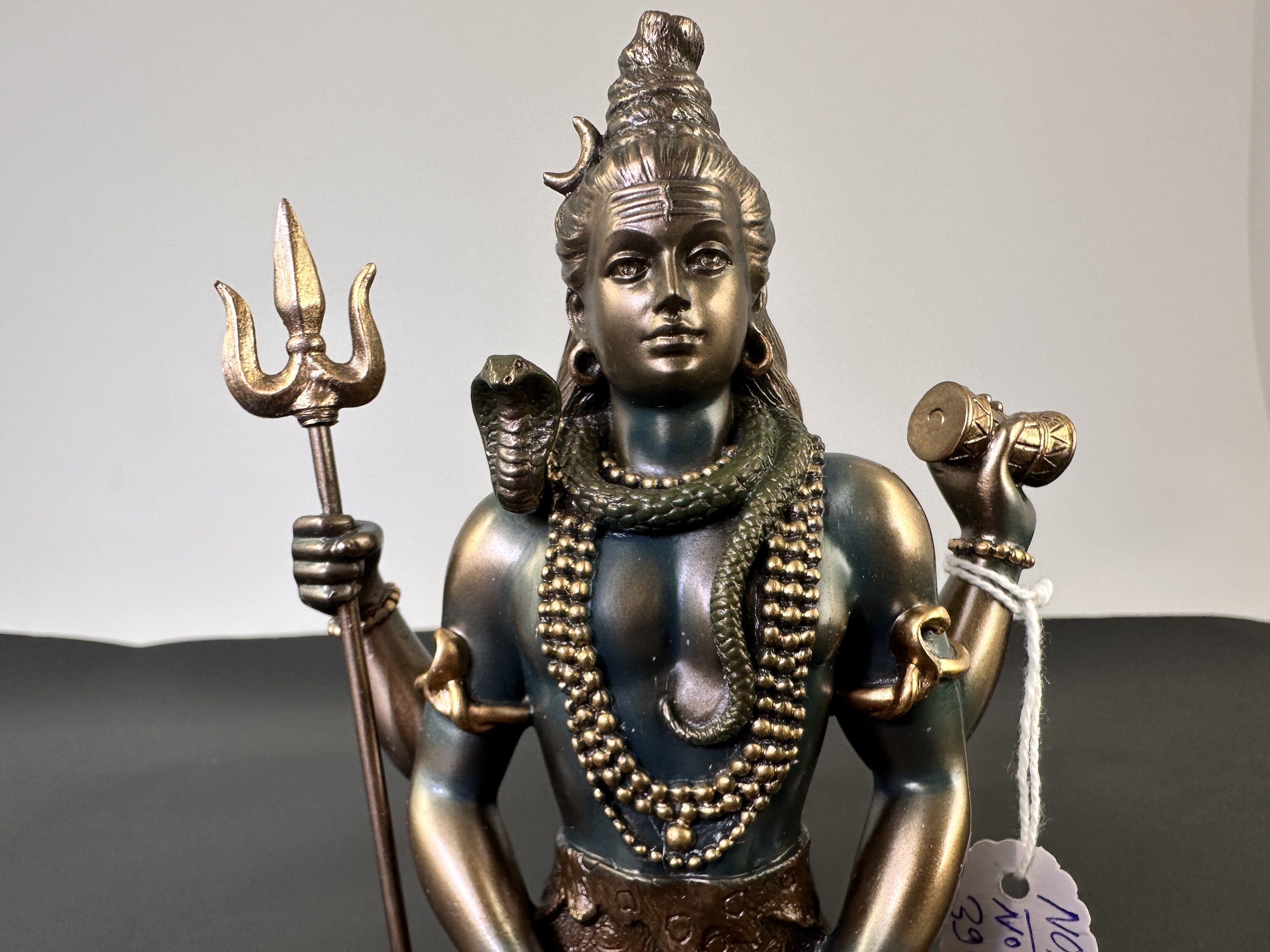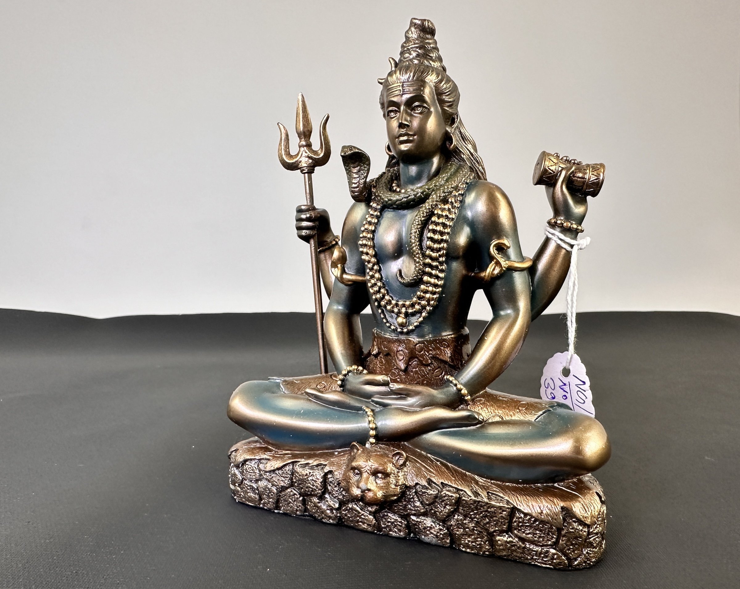 Nádherně detailně i barevně provedená soška nejvyššího božstva Šivy (Shivy) ze syntetického materiálu zvaného kovové vlákno, které je na pohled i na pohmat nerozeznatelné od kovu. Zobrazení Šivy (Shivy) v sedě s trojzubcem (trishula) a půlměsícem ve vlasech je plné symboliky a významu. Šiva je znám jako ničitel a zároveň transformátor, který hraje klíčovou roli v cyklu stvoření, udržování a zániku vesmíru. Jeho postava je obklopena mnoha symboly, které odkazují na jeho moc, aspekty a učení.