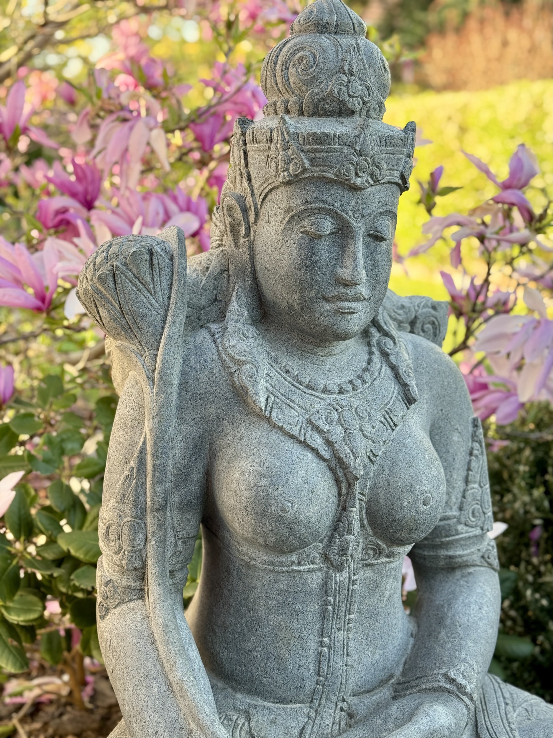 Elegantní socha hinduistické bohyně Dewi vytesaná z přírodního říčního kamene spojuje jemnost ženské krásy s duchovní hloubkou. Se svou výškou 105 cm působí uctivě, ale není přehnaně monumentální – ideální pro umístění do menších zahrad, vstupních prostor, relaxačních koutů nebo interiérů s orientální atmosférou.