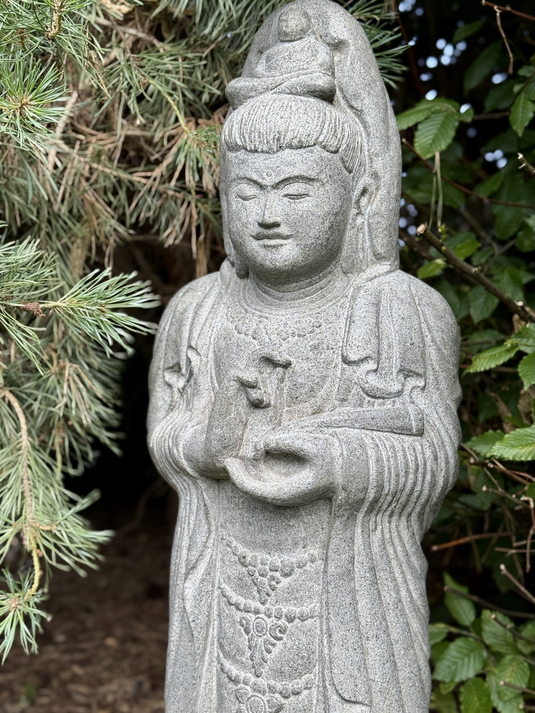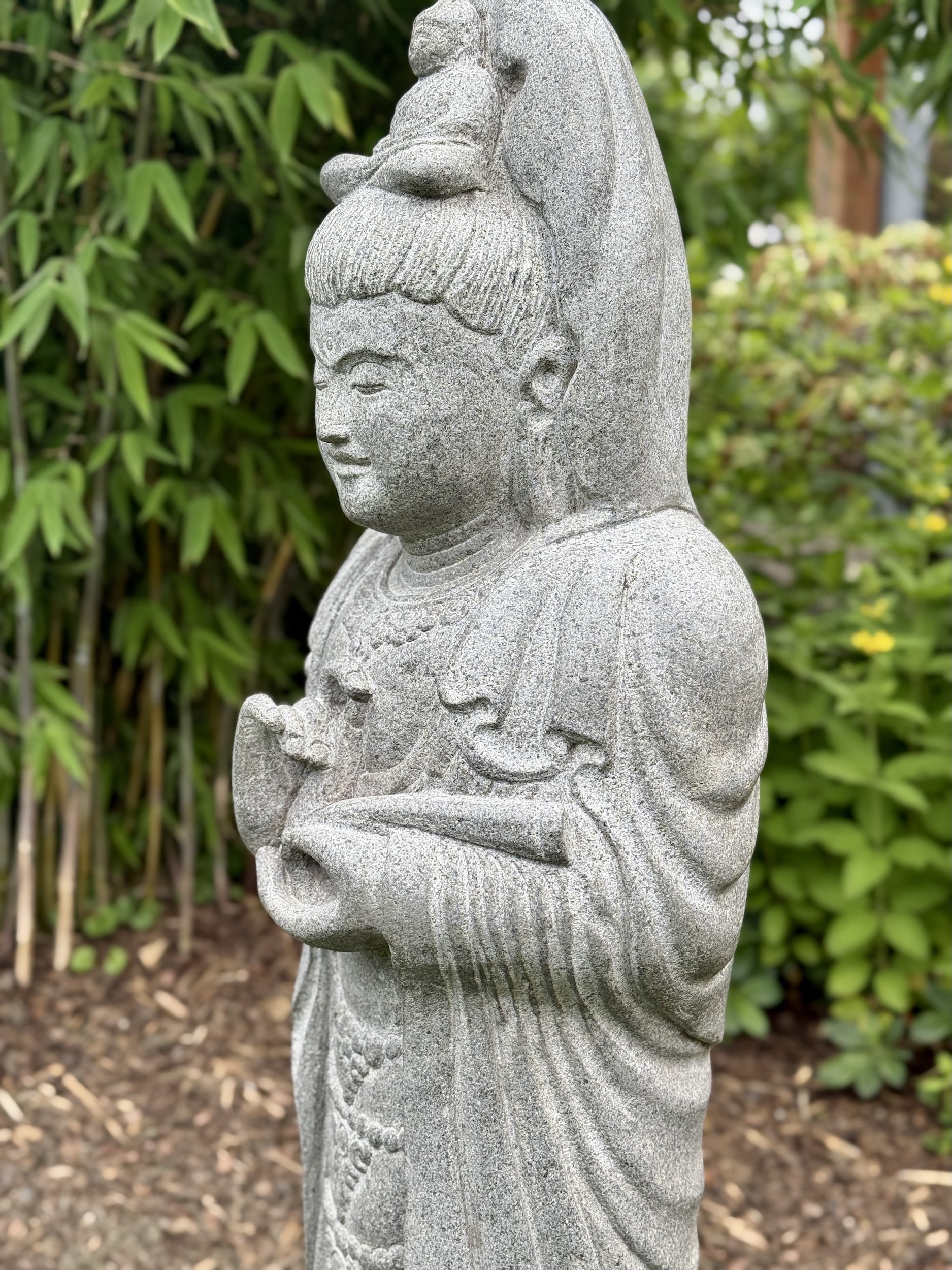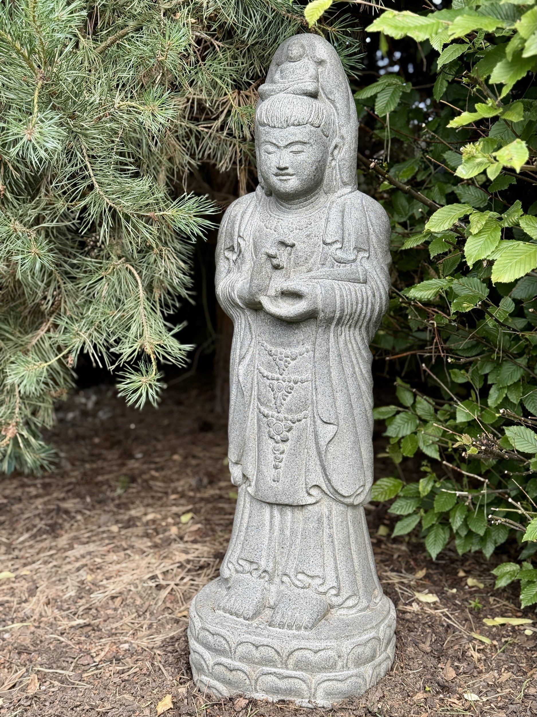Tato jemně propracovaná socha zobrazuje Kuan Yin – bodhisattvu soucitu Avalókitéšvaru v ženské podobě, která v buddhistické tradici ochraňuje bytosti a vnáší mír a laskavost do prostoru, kde je umístěna. Její jméno znamená "Ta, která vyslyší modlitby". Vytesaná ručně z tvrdého říčního kamene na Bali představuje nejen duchovní symbol, ale i výrazný estetický prvek.