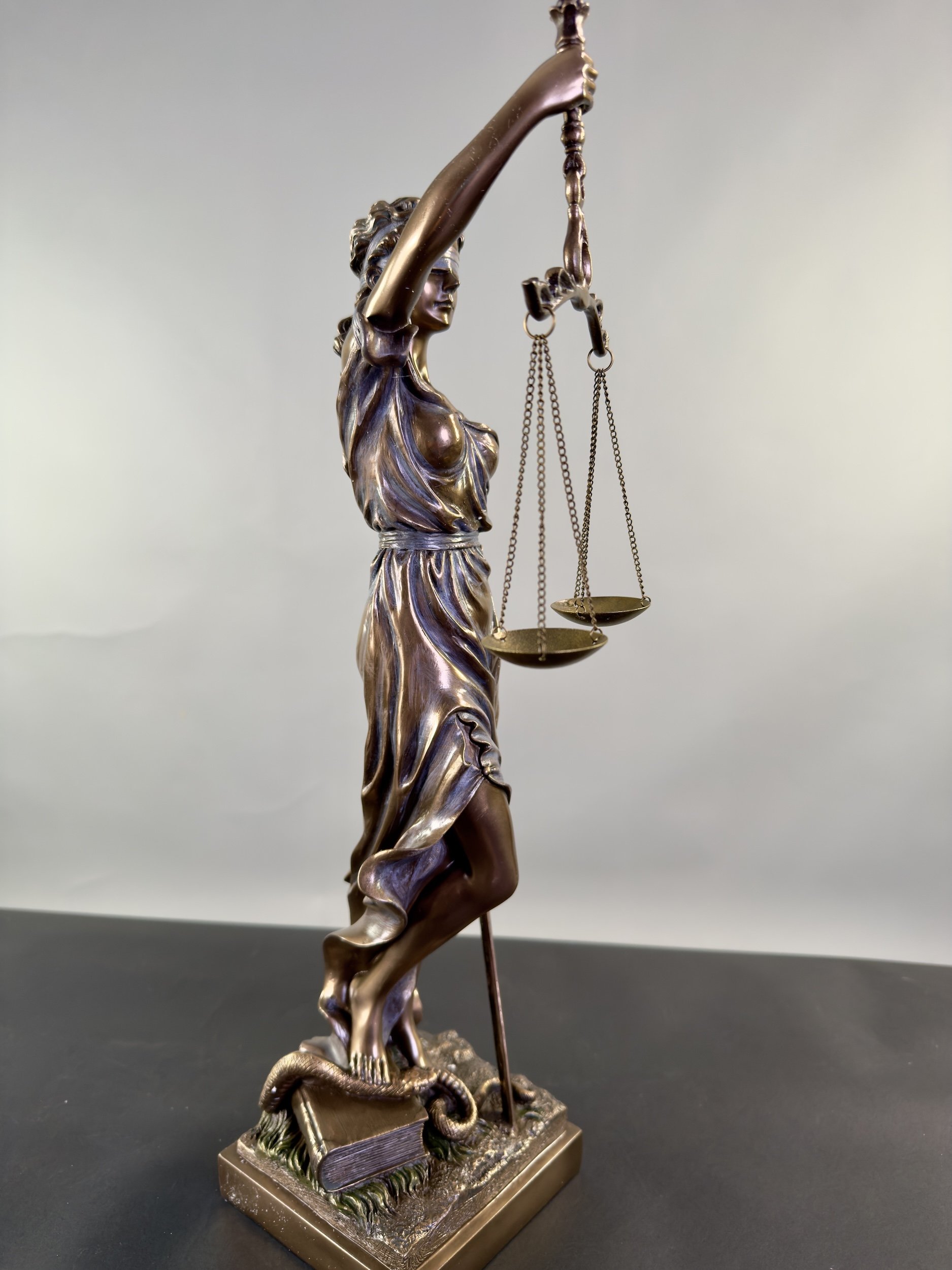 Soška Spravedlnost je vyrobená v Indii ze syntetického materiálu zvaného kovové vlákno, které skutečně budí dojem kovu. Socha je ve dvou velikostech, 20 a 46 cm, ze kterých si můžete vybrat. Soška spravedlnosti s váhami je silným a univerzálním symbolem práva a spravedlnosti. Tento symbol má několik klíčových prvků, které společně vyjadřují základní principy spravedlnosti: