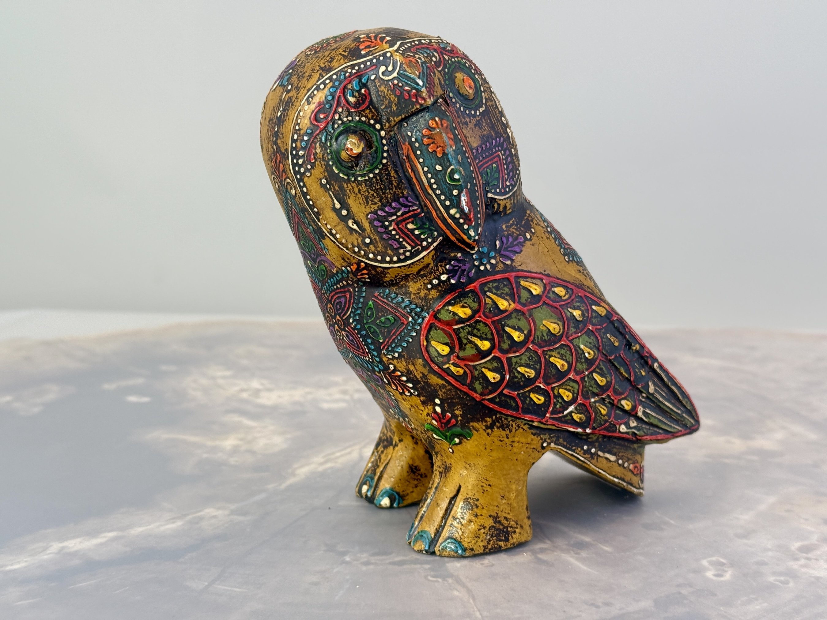 Malovaná soška sovy 17 cm vyrobená v Radžastánu v Indii. V indické kultuře a tradici je sova považována za nositelku moudrosti, prosperity a duchovní síly. Sova je často spojována s učením, intuicí a schopností vidět věci jasně, i v temnotě. Tento význam se objevuje i v jiných kulturách po celém světě. V hinduismu je sova považována za vahan (dopravní prostředek) bohyně Lakšmí, která představuje hojnost, bohatství a prosperitu. Proto může být soška sovy vnímána jako ochranný amulet, přitahující prosperitu. Dřevěné sošky sov se někdy umisťují do domů nebo zahrad, aby chránily před zlými duchy nebo negativními vlivy. Sova je vnímána jako bdělý ochránce, který si všimne i toho, co ostatní přehlédnou. Sova je také spojována s duchovním probuzením a vnímáním skrytých pravd. Ve své tichosti a pozorování se stává symbolem meditace a hlubšího pochopení.