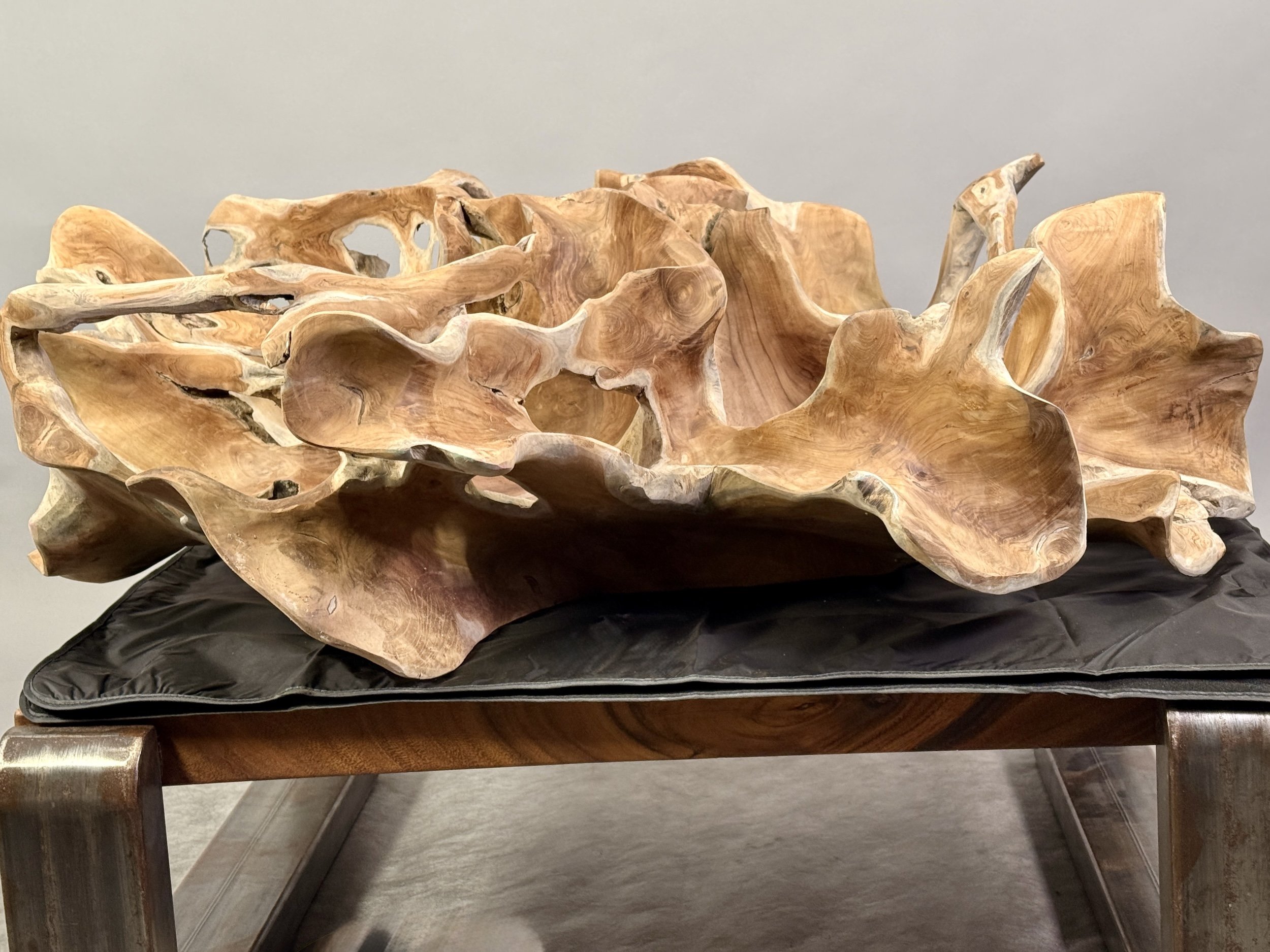 Teakové kořenové dřevo je známé svou výjimečnou životností, odolností proti vlhkosti i krásnou kresbou, která v interiéru působí teplým, uklidňujícím dojmem.