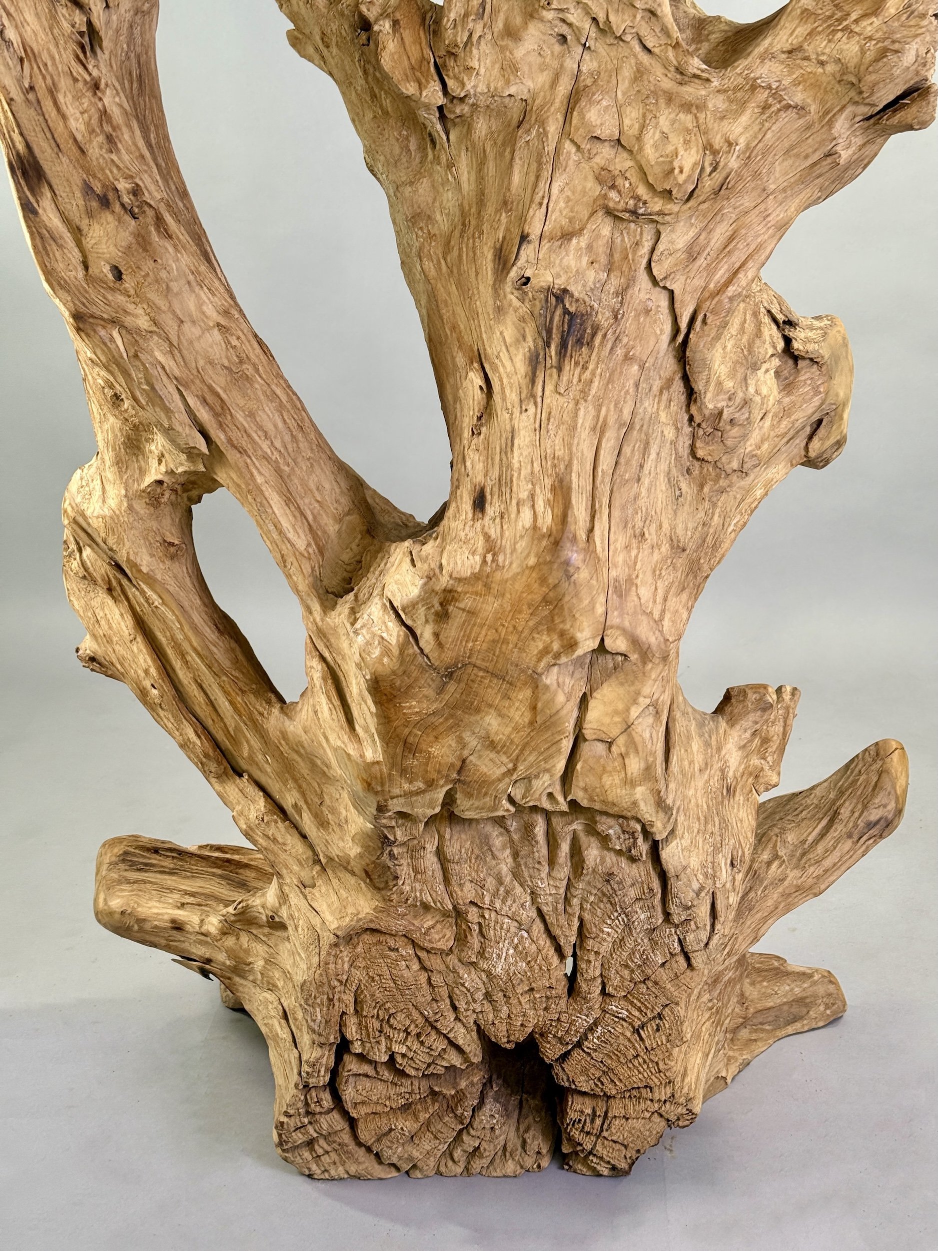 Dřevo pochází z Jávy, kde bylo ručně očištěno tak, aby vynikla jeho organická struktura. Masivní základna a vysoké výběžky vytvářejí působivý vertikální prvek, který zaujme z každého úhlu. Vzhledem ke své výšce a členitosti je tento kus ideální volbou pro ty, kdo hledají výjimečný přírodní objekt s charakterem.