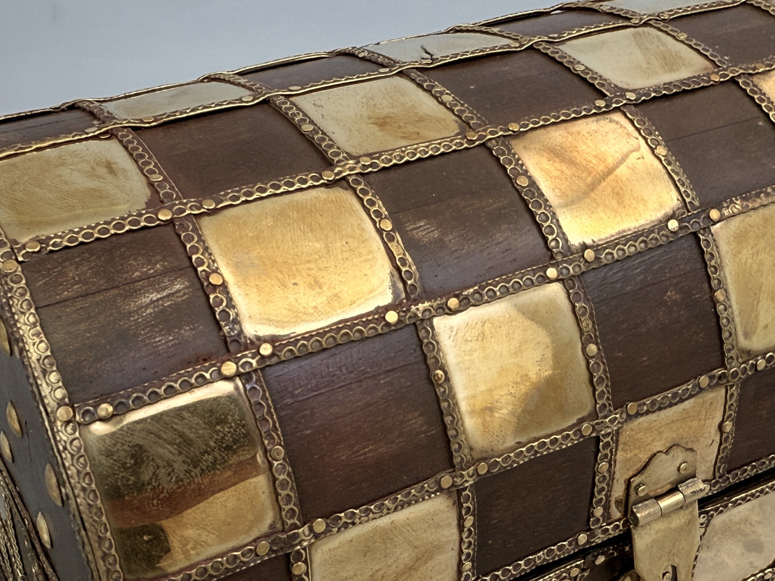 Truhlička z tropického dřeva s aplikovanými kovovými čtvercovými plátky a dekoracemi, vyložená saténem. Radžastán, Indie.
