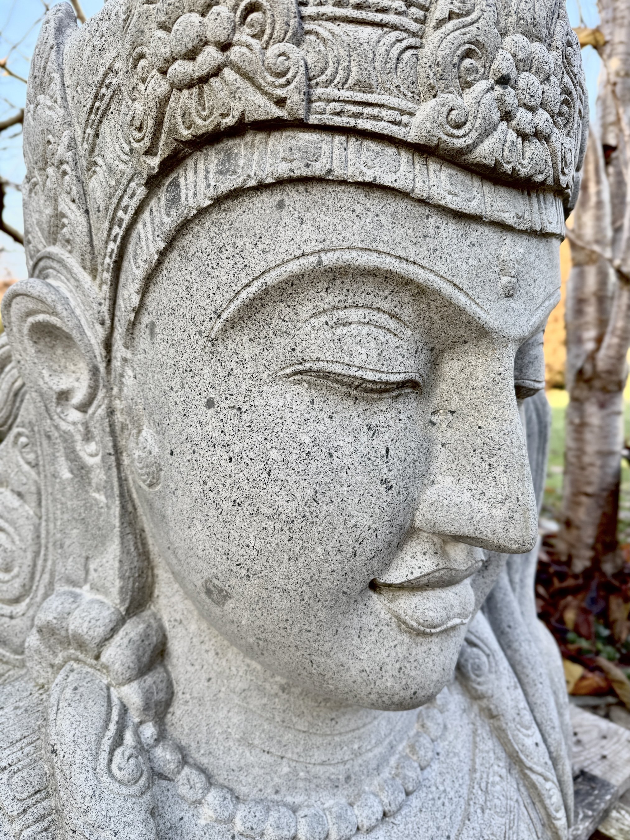 Tato konkrétní socha je skladem. Socha je slevněná protože v kameni lze nalézt několik menších prasklin - viz fota, opravovaných již v Indonézii. Je naimpregnovaná a nehrozí, že by se praskliny dále rozšiřovaly.