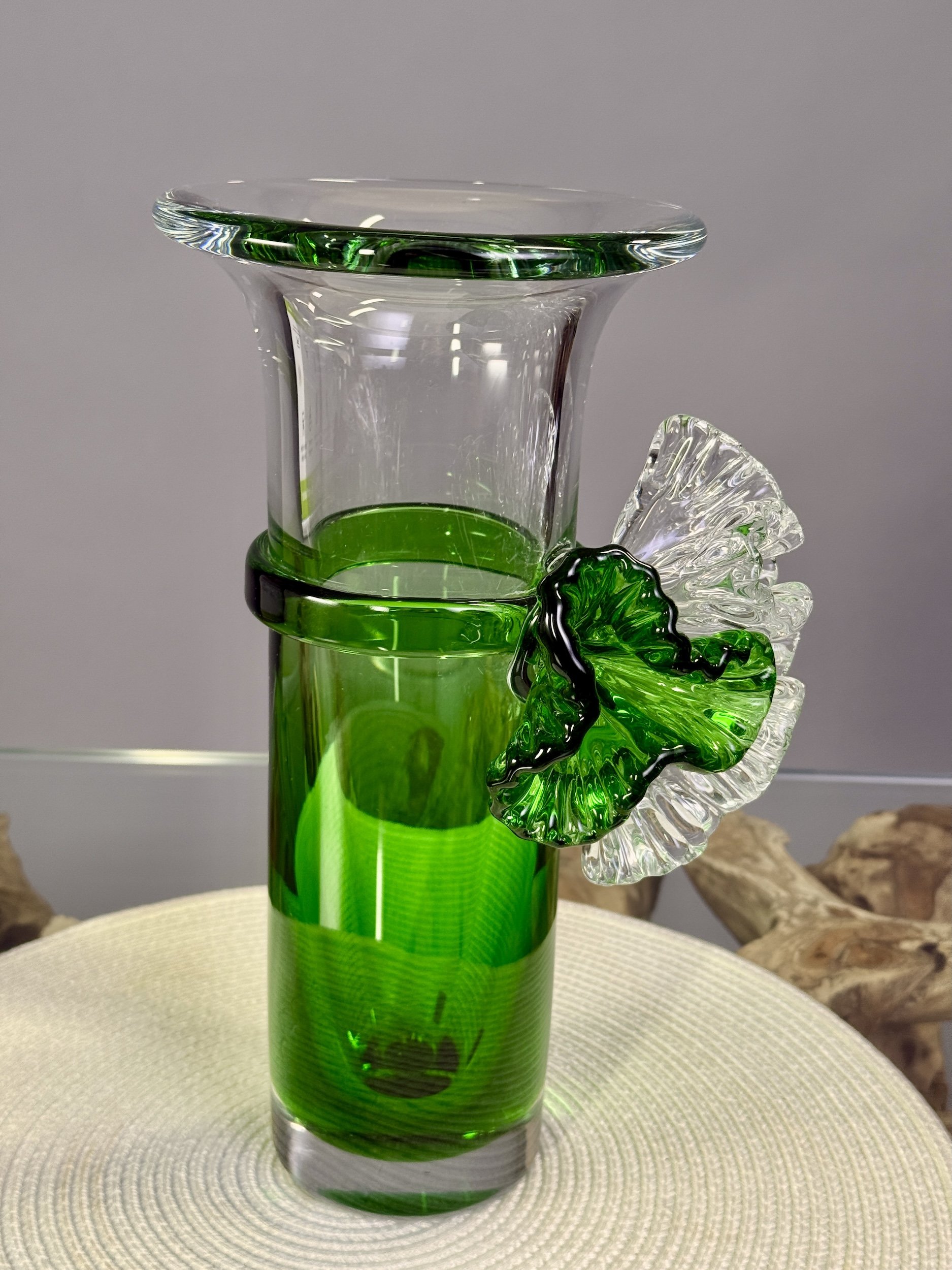 Každá váza je ručně tvarována přímo z hmoty skla při vysoké teplotě, díky čemuž je každý kus naprostý originál. Spojení čirého a zeleného skla vytváří při dopadu světla nádherné barevné přechody a odlesky. Plastický květ, který obepíná tělo vázy, je ručně modelovaný přímo na horké hmotě, a stává se tak nejen dekorem, ale i uměleckým akcentem.