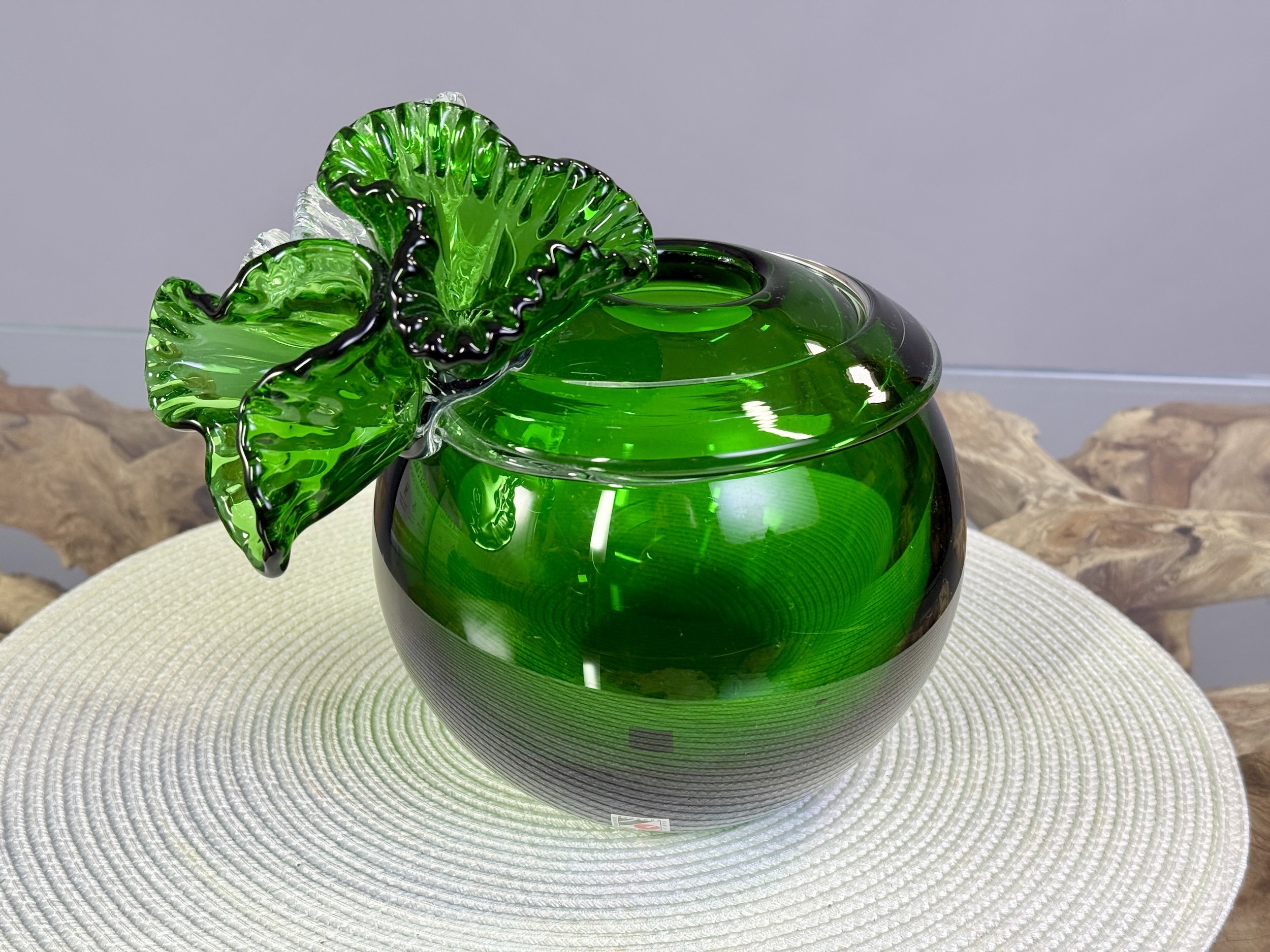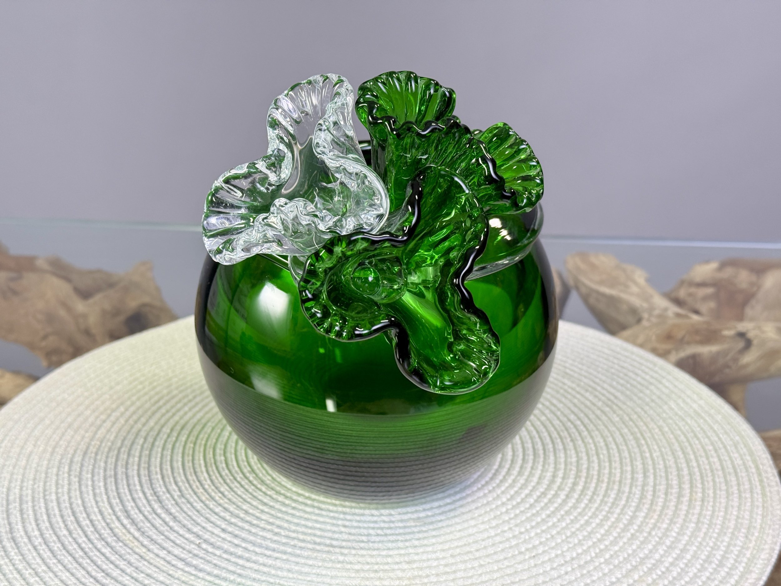 Tato kulová váza z hutně tvarovaného skla v sytém odstínu zelené je dílem renomovaného českého sklářského ateliéru AGS Svoboda, známého po celém světě díky mistrovskému zpracování hutního skla. Na první pohled zaujme svým plastickým květem, který byl ručně modelován přímo při tavení skla. Výsledkem je sochařsky působící objekt, který spojuje eleganci, sílu materiálu a umělecký detail.